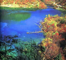 It's the largest lake in Jiuzhaigou Valley, covering an area of 7.5 km, long and 0.375 km. wide. It is 3103 metres above sea level, with a maximum depth of 103 metres. The melted snow from the South Peak and the waters of surrounding mountain streams and brooks all find their way into the Lade which has no exit. The excess water either vapours or seeps into the earth. The waters never spill over the banks in spite of downpours in summer and autumn. The Lake won't dry up either in spring and winter, even there's a long dry spell. In spring, Jiuzhaigou Valley is radiant and enchanting. The air is filled with fragrance of wild blossoms. In summer, the beautiful trees are luxuriantly green. In autumn, the breeze is intoxicating, while tree leaves turn crimson. In winter, the mountains and valleys are wrapped in snow and ice. |
