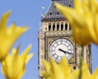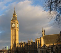 泰晤士河畔议会大厦的北面,耸立着高高的钟楼,镶有大钟,名 为“大本”。每隔一小时,大钟根据格林威治时间发出沉重而铿锵的响声,在数英 里之外也能听到钟声的回荡。 1859年,大钟由当时的英王工务大臣本杰明?霍尔爵士监制,大钟共重21吨,铸造时耗资2.7万英镑。“大本”钟被视为伦敦的象征,凡到伦敦观光的人,无不想到钟楼周围,站在 议会桥上欣赏伦敦这个独具一格的建筑。