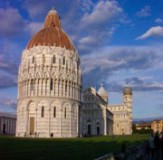 比萨城(Pisa),位于佛罗伦萨西北方向,历史上是个海滨城市。随着陆地的扩展,比萨距海越来越远了,但这并不能使人遗忘比萨曾作为海上共和国威镇八方的历史和它作为联结东西方纽带曾起的重要作用。而且,正因为它的历史,它的建筑艺术,今日,比萨已成为著名的旅游城市。 比萨的名气,很大程度上是受惠于比萨斜塔。该塔竣工于1350年,但是工程早于1174年就开始了。当年,工程进行到第三层时,人们就发现,由于地基、建筑结构等原因,塔身出现了倾斜。于是工程中断了。后来,当政者变了,又延请了新建筑师继续了此工程。随着时间的推移,比萨塔的倾斜程度不断增大,目前已达到4.5米,而且倾斜度还以每年1毫米的速度继续增加。可能正是由于它的斜,和别人不一样,名气应了“歪打正着”,变得越来越大,参观者络绎不绝。