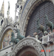 6尊飞翔的天使簇拥在雕像下。入口处的上部有4座青铜马像(复制品),真品现在收藏在教堂内,这是公元前四世纪的青铜驷马,威尼斯人在1204年掠夺自君士坦丁堡,虽然曾被做拿破仑带回巴黎,但后来又回到了威尼斯,在圣马可教堂的博物馆内可见到它们的踪迹。圆形天花板上的镶嵌画是从圣经旧约全书中取题的。教堂的正面五个入口及其华丽的罗马拱门是陆续完成于十七世纪,在入口的拱门上方则是五幅描述圣马可事迹的镶嵌画,分别是"从君士坦丁堡运回圣马可遗体"、"遗体到达威尼斯"、"最后的审判"、"圣马可神话礼赞"、"圣马可进入圣马可教堂"等五个设计师主题,金碧辉煌非常的耀眼。右边洗礼堂的镶嵌画也很美丽。位于中央祭坛的后面的是代表这座寺院的珍宝。制作于976年,其后经过修补,镶有宝石等,非常漂亮。寺院右端有珍宝馆,陈列在1204年十字军从君士坦丁堡带回来的战利品。接下来,还可以见到内部丰富的艺术展品收藏品,这些收藏都是来自世界各地的,因为从1075年起,所有从海外返回威尼斯的船只都必须缴交一件珍贵的礼物,用来装饰这间“圣马可之家”。教堂的内部,从地板、墙壁到天花板上,都是细致的镶嵌画作,其主题涵盖了十二使徒的布道、基督受难、基督与先知以及圣人的肖像等,这些画作都覆盖着一层闪闪发亮的金箔,使得整座教堂都笼罩在金色的光芒里,教堂又被称之为“金色大教堂”。教堂内殿中间最后方的黄金祭坛,祭坛之下是圣徒马可的坟墓。祭坛后方置有高1. 4米、宽3. 48米的金色围屏,屏面上有80多幅描绘耶酥、圣母、门徒马可行事的瓷片,在这个画面上共有2500多颗钻石、红绿宝石、珍珠、黄玉、祖母绿和紫水晶等珠宝来装饰;中央的圆顶是一幅耶酥升天的庞大镶嵌画,是由一群威尼斯非常优秀的工匠在十三世纪所完成的。这座伟大的教堂在1807年之前一直是威尼斯总督的私人礼拜堂。夏天请注意:圣马可教堂不许穿无袖或短裤入内。