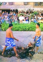 一只卡卢阿烤猪。做这样一只烤猪得费好几道工序:先在地上挖一个洞,周围用岩石围起来,用牧豆树做柴火;等岩石烧热的时候,用巨朱熏和香蕉的树叶裹好整只猪,再放进特制的罐里;烤上四至八个小时就可以拿出来食用了,开罐的时候也表示宴会正式开始了。与烤猪一起食用的菜肴一般是香蕉、 菠萝、甜薯、椰汁布丁,也有鸡肉、牛肉和鱼,还有各种各样的热带水果汁。在进行过波利尼西亚歌舞表演之后,宴会才算结束。不同的宴会有不同的节目,但男女一起跳草裙舞是必不可少的。