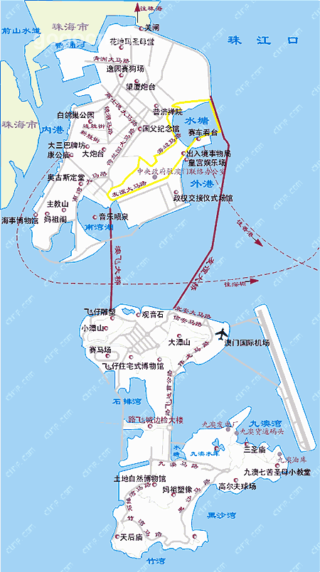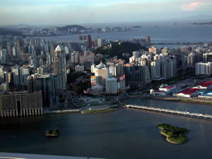 | 澳门位于我国大陆东南部沿海,正处珠江口西岸,与香港、广州鼎足分立于珠江三角洲的外缘。东隔伶仃洋与香港相望,西与广东省珠海市的湾仔镇一衣带水,只隔一条不足1公里宽的濠江水道。北边以古老砂堤与珠海市的拱北相连,陆界只有240米。南面则濒临浩瀚的南海。澳门位居东南亚航线的中继点,是16、17世纪东西方贸易的重要港口。往西北沿西江上溯,可达广东肇庆、广西梧州等地,沿途物产丰富、经济繁荣。如此优越的地理位置,对它本身及其邻近地区的经济发展都起着相当重要的作用。澳门地区面积23.5平方公里,包括澳门半岛(乙上水)与仔、路环两个离岛,澳门半岛面积7.65平方公里,(乙上水)仔岛路环岛5.69平方公里,路环岛8.07平方平方公里。大多数人居住在澳门半岛,人口密度为2500人/平方公里,呈超级过密状态。