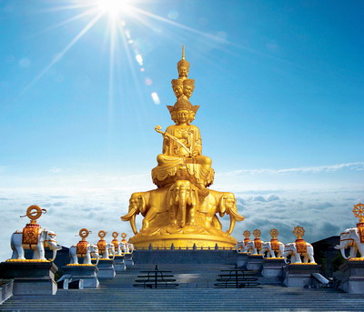 峨眉山为普贤菩萨道场,是我国四大佛教圣地之一。?相传佛教于公元1世纪即传入峨眉山。近2000年的佛教发展历程,给峨眉山留下了丰富的佛教文化遗产,造就了许多高僧大德,使峨眉山逐步成为中国乃至世界影响甚深的佛教圣地。目前,全山共有僧尼约300人,寺庙近30座,其中著名的有报国寺、伏虎寺、清音阁、洪椿坪、仙峰寺、洗象池、金顶华藏寺、万年寺……等。寺庙中的佛教造像?有泥塑、木雕、玉刻、铜铁铸、瓷制、脱纱等,造型生动,工艺精湛。如万年寺的铜铸“普贤骑象”,堪称山中一绝,为国家一级保护文物,阿弥陀佛铜像,三身佛铜像,报国寺内的脱纱七佛等,均为珍贵的佛教造像。还有贝叶经、华严铜塔、圣积晚钟、金顶铜碑、普贤金印,均为珍贵的佛教文物。峨眉山佛教音乐丰富多彩,独树一帜。峨眉山武术作为中国武术三大流派之一享誉海内外。这些丰富的佛教文化遗产是中华民族文化宝库中的瑰宝。