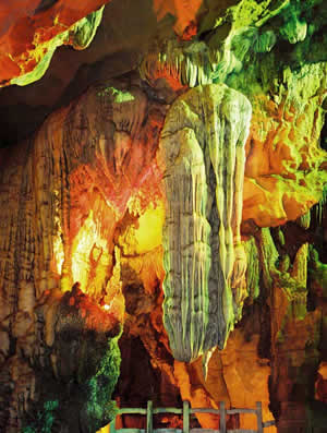 冠岩的四层洞门,进入每层洞门都有一个饶有趣味的天地。洞上光怪陆离的锺乳石和幽深的潭水, 幻化 出神奇的水晶宫殿。