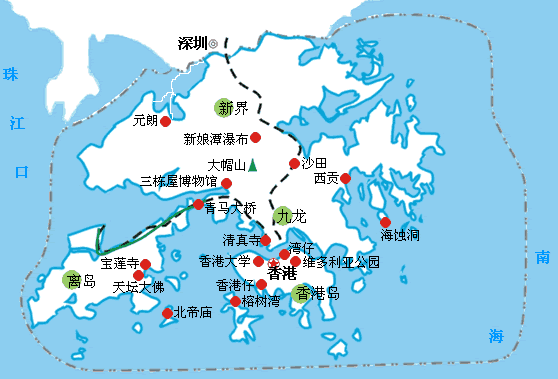 面积:香港有三大部分,即香港岛(约80平方公里);九龙(约47平方公里)和新界(连260多个小岛约共968平方公里),另加小量填海地,总面积约1,100平方公里,略大过上海市的六分之一,及仅大于全中国面积的万分之一。