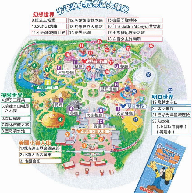 香港迪士尼乐园第一期分为4个主题园区:美国小镇大街、探险世界(2007年5月4日-9月2日为海盗世界)、幻想世界及明日世界。