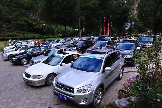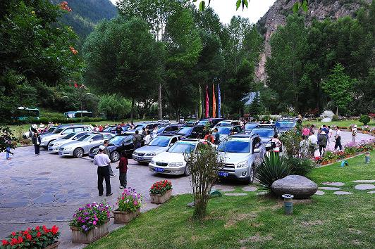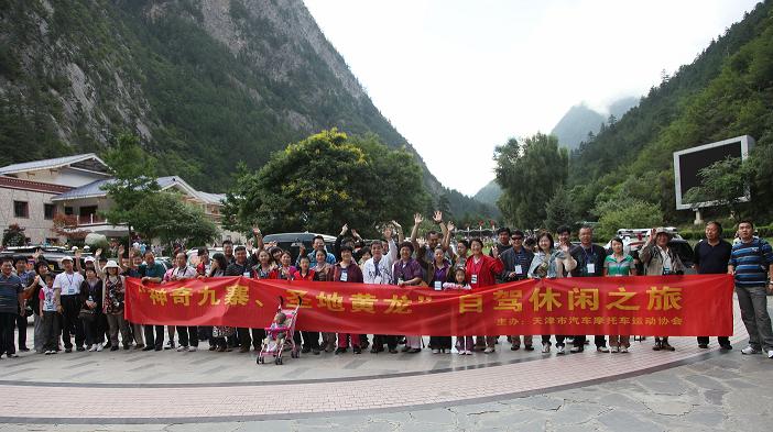 上午8时,天津市汽车摩托车运动协会将贴有九寨沟黄龙美景宣传图片的座驾开到了沟口,整齐列队,向九寨沟景区和前来旅游的游客献上真诚的问候。