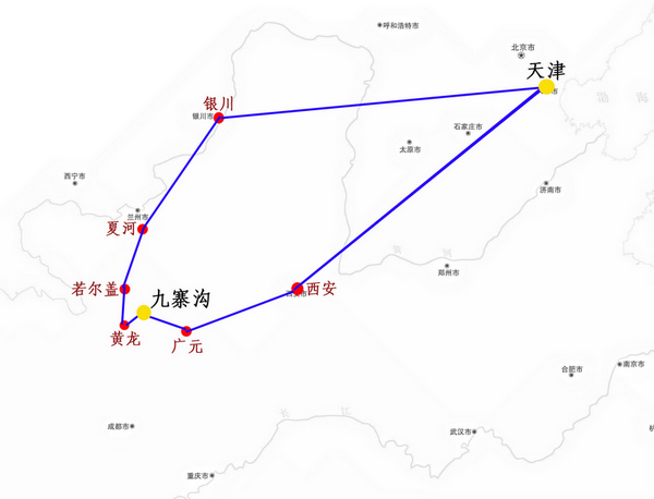 此次自驾游车队于7月24日从天津出发,经西安、广元后于7月26日到达九寨沟景区。7月28日从黄龙出发,经若尔盖、夏河、银川返回天津,共计9天,行程约4500公里。