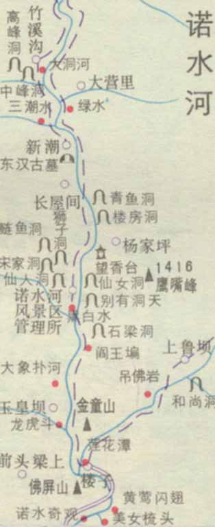 诺水河,发源于陕西省南郑县,两岸群峰耸峙,壁陡如削,沟纵横,林海茫茫,山、水、洞、林各呈姿态,尤以规模宏大的地下溶洞令为观止,数以百计的地下溶洞,或临清溪,或处绝壁,宏大深遂,诺水河畔,山山有洞,洞中有洞,洞洞独特,雄壮绝妙,奇趣多端,明进士向玉轩,弃官隐居诺水河,以清新的写意,传奇的画笔,对洞天赞颂曰: