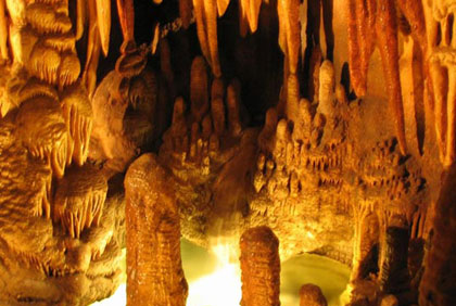 三座人形岩石,人称阎罗法王和其黑白两助手,还有许多天然佛像。再向前行,内套红色、青色两大溶洞,皆深不可测,再强的手电筒亮光,在洞中都形如萤火,连脚下都看不清楚。民间传说一条洞长100多公里,另一条长达200多公里,具有极高的科学考察和探险价值。