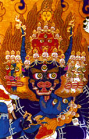 护法神题材:显密二宗都有护法神,显宗最著名的是四大天王。护法神具有非凡的神通,多为释迦牟尼或高僧大德们收服的外道异教神灵,立誓皈依佛法,捍卫佛法和佛教修行者在修行过程中免受生理和心理方面的伤害。密宗中护法神较多,一般都是获得圣者果位的出世间护法神。最负盛名的护法神有八位:吉祥天女、白梵天、姊妹护法、多闻天、大黑天、马头明王、大威德金刚等。