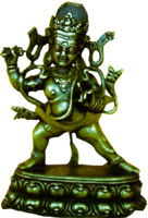 本尊神题材:本尊是藏传佛教密宗艺术中最为重要的一个题材,是修行者在修行过程中观想的对象,借助本尊在修行过程中顺利成佛,达到梵我不二的境界。各个教派依怙的本尊不一样,每个人可以根据自己成就的需要选择相应的本尊。雕塑中常见的本尊多为胜乐金刚、密集金刚、大幻金刚、布禄金刚、呼金刚、时轮金刚、亥茹迹等。造型多为多头多臂多足,静相、猛相兼有,每面三眼,多拥抱明妃。