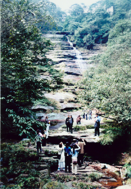 香草叠溪逶迤曲折,清澈的溪水呈十几级台阶淌下;月洞飞水高六十多米,山崖顶部有一天生的月形拱洞,一股激流从洞中飞跃而出,呈之字形铺陈而下;蟠龙瀑布三面绝壁,略呈弧形,瀑布正面高80余米,四季珠玉飞溅,水雾弥漫。